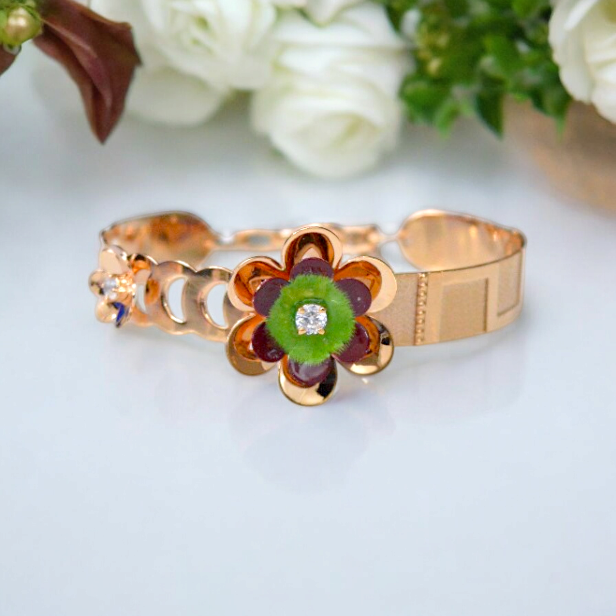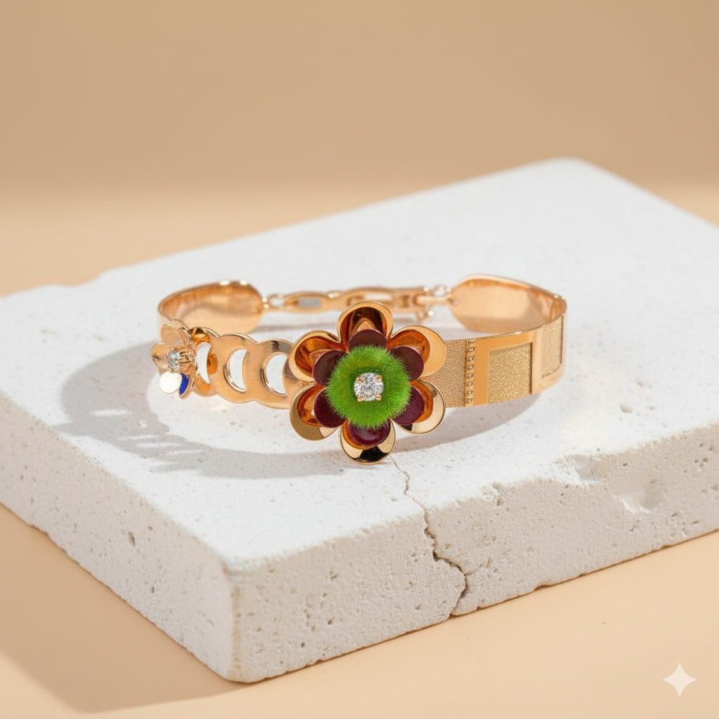 At the center of the flower, a brilliant cubic zirconia (CZ) stone adds a dazzling touch of sparkle. The bracelet band combines smooth gold surfaces with intricate cut-out detailing, adding to its elegance and contemporary appeal. ✨ Weight: 11.660 Grms