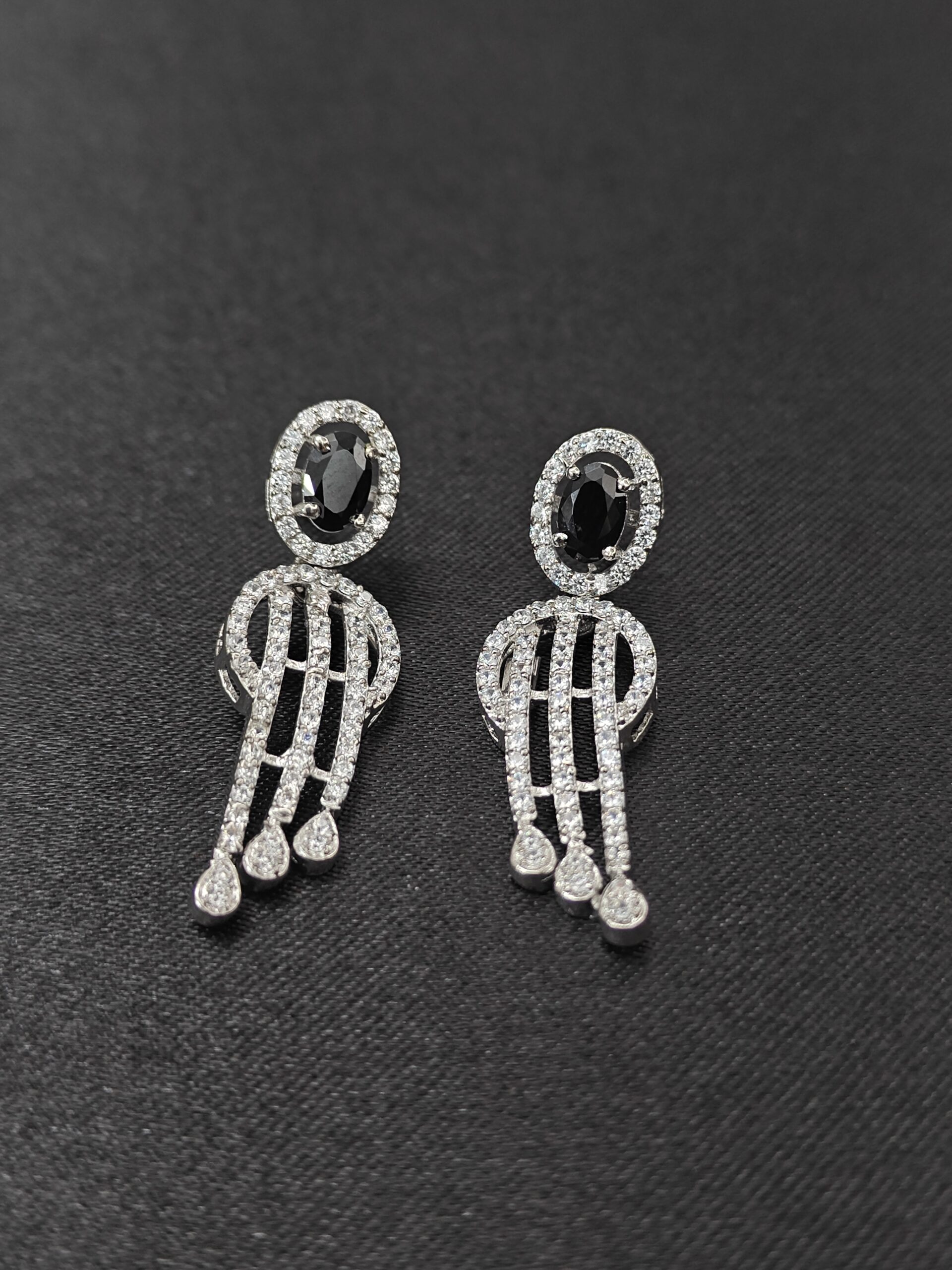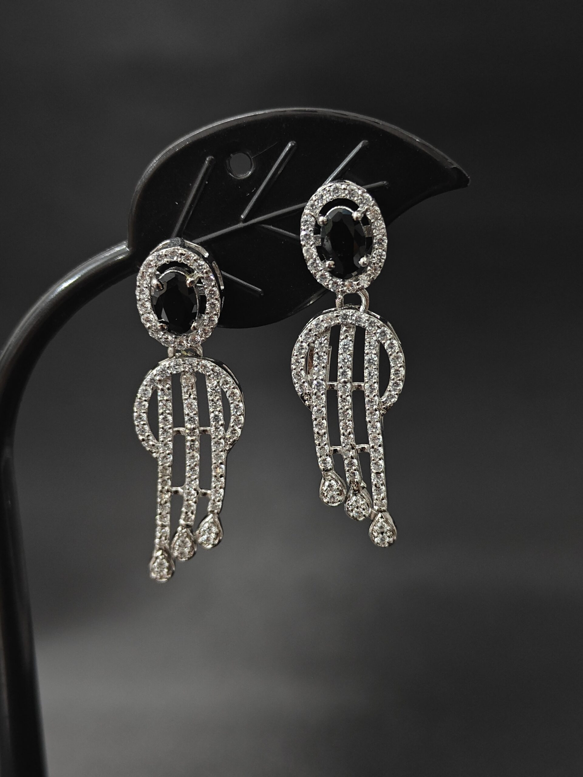 These exquisite earrings feature a bold black stone framed with dazzling zircons, crafted in 92.5 Sterling Silver. Their cascading design adds timeless charm — perfect for […]